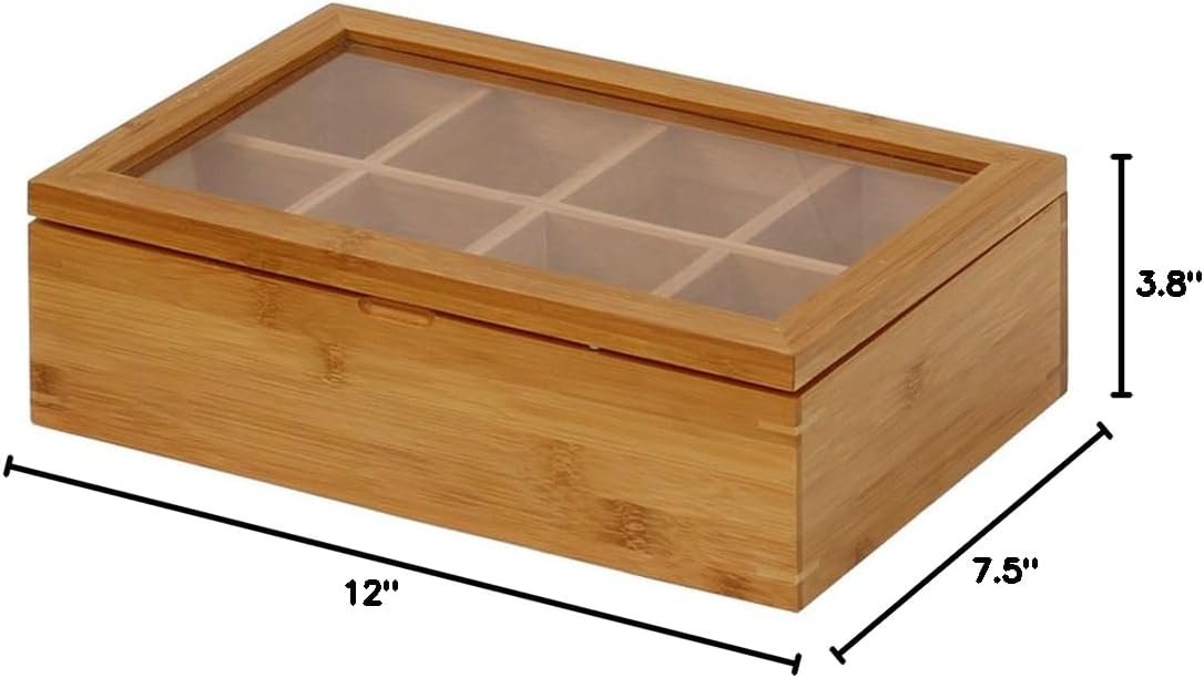 - Bamboo framed lid with an acrylic lid tea box design allows for instant visibility of contents, so you’ll never fumble for your favorite blend again.