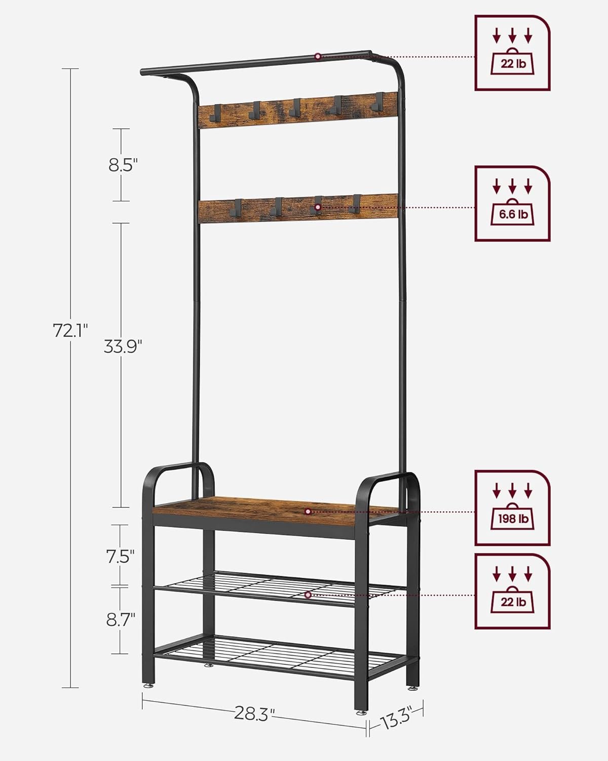 This model is rated to hold up to 198 lbs on the seat, thanks to its steel frame and sturdy particleboard construction. - Are the coat hooks adjustable or fixed?